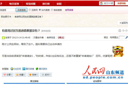 在查询中记者还发现,尹先生的遭遇并非是个例,在玩卡网民生银行卡的栏目中,记者看到ID为“wld0918”的用户2012年5月14日发帖子称“当自助语音到‘申请请按1’的时候,咋按1也没有反应,还是不断重复‘申请请按1’, 尼玛,坑爹呢吧。”