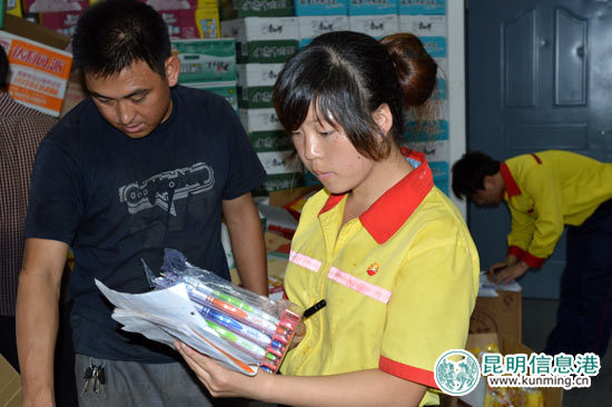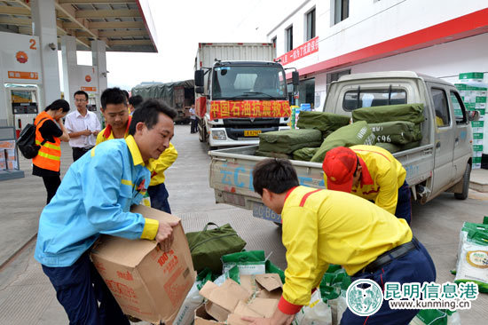 各站点悬挂救灾横幅,准备了饮用水等免费赠送给救援车辆。昆明信息港记者林坚/摄