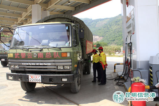 中石油彝良加油站在为抗震救援军车供油。昆明信息港记者林坚/摄
