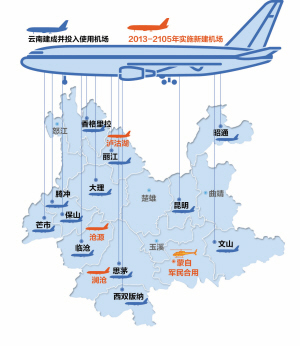 “到2015年,将新建民用机场4个,云南民用机场运营和在建总数达16个。”云南省人民政府出台的《关于进一步加快民用机场建设的实施意见》(下简称《意见》)称,两年后,昆明长水国际机场将培育成面向东南亚、南亚和连接欧亚非的国家门户枢纽机场。