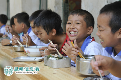 肉是山里孩子过年才能有的享受,新厨房落成的第一天就让孩子们吃上了肉,吃着肉的孩 子们乐开了花