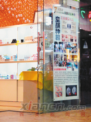 不过记者看到,一家名为“指尚工作室”的美甲店的一角,却整齐地摆放着一堆“童颜神器”,并且标明了“正品泰国代购”的字样,在透明玻璃上,这家店还贴着“童颜神器”的广告宣传,上面像模像样地“指导”消费者如何选购“正品”的“童颜神器”,还标注了“7天见效”的字样,而一些使用前后的对比照片,更是吸引人。据售货员介绍,现在这款“神器”正在特价销售,只要200多元。