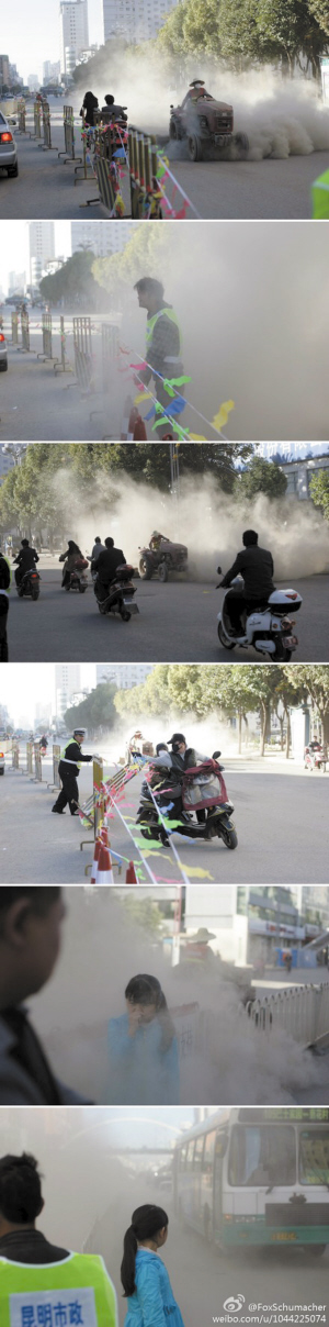 昨天上午,@FoxSchumacher在新浪微博上发出一则消息称,当天早上的北京路凤凰村公交站附近,因为修路的原因,不仅道路只留下半幅通行,使得车辆被堵了20分钟,而且道路上灰尘滚滚。该网友感叹:“这扬尘感觉比吸20年烟还要伤。”同时配发了一组扬尘的照片。
