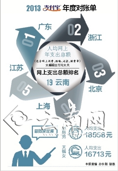 2013年,云南省的支付宝网上支出金额同比大幅增加87%,占全国总额1.38%,排第19位。其中昆明的支付宝用户2013年人均网上支出15104元,排全国第28位,其中人均网上购物消费10772元,缴费支出695元。