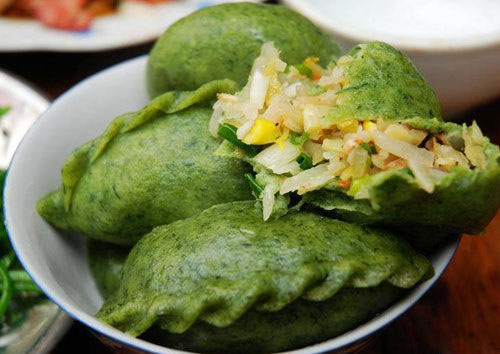 馅儿有豆腐干和着韭菜的,有熏肥肠拌芥菜末的。有包成团子的,有做成圆饼的,也有包成饺子样但更精致些的,那皱褶的花边一个个碧绿剔透,美丽极了。