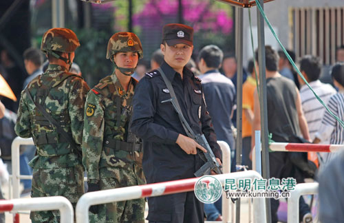 在昆明火车站警察与武警共同值守保平安。记者李海曦/摄