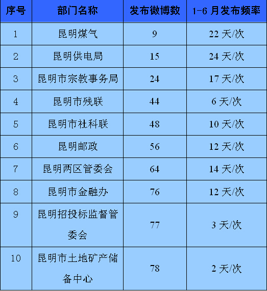 根据昆明信息港对“昆明发布厅”维护情况统计数据显示,微博发布数排在最后10名的部门分别是:昆明煤气、昆明供电局、昆明市宗教事务局、昆明市残联、昆明市社科联、昆明邮政、昆明两区管委会、昆明市金融办、昆明招投标监督管委会以及昆明市土地矿产储备中心。上述十个政务微博在微博发布数量、与网友互动次数、发布频率等指标上都远远低于“昆明发布厅”上半年的平均水平。