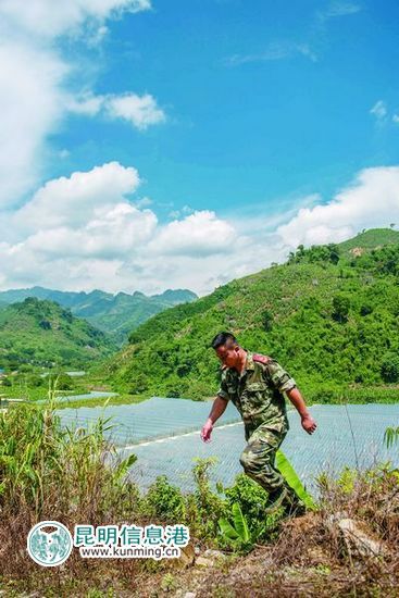 8月上旬,中越边境河口县,气温高达36度。马开福把迷彩服的袖子卷得老高,爬到半山上检查大棚情况 记者杨帆/摄
