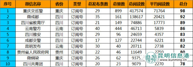 昆明信息港讯 记者袁艳 9月1日至9月5日,腾讯网通过对阅读数、点赞数、发布条数等指标进行了统计和梳理,从传播力、活跃度、触达率等维度对西南地区的政务微信号进行了分析,排出了西南地区最值得关注的10个政务微信号,云南2账号上榜。
