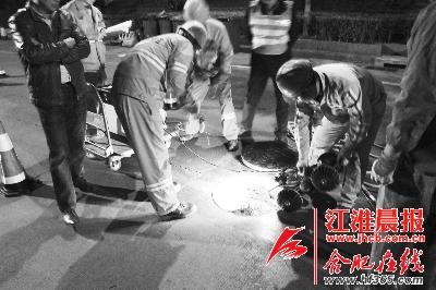 10月14日22时,合肥市阜南路上穿着反光背心的排水工人打开一座座排水井盖,对排水管网安全运行进行检测。与以往的检测不同,这次不需要大家亲自潜入排水管,代劳的是一个小机器人,这在全省尚属首次。