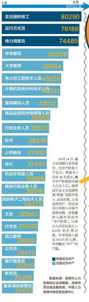10月14日,瑞士信贷银行发布报告,为中产阶级下个定义:财富为1万至10万美元,属于中产阶级的中国人已达3亿。虽然这个定义未说清所谓“财富”是指年收入,还是存款,又或是净资产,但还是可以年收入来做个简单对照,看看哪些人能有望成为“中产阶级”。以昨日人民币兑美元1:6.1133的汇率计算,年平均收入超过61133的人群,有望触及“中产”的门槛。
