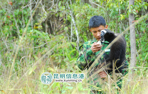 测试由常年给长臂猿提供人工补给的动物保护观察员金工文配合进行。由于长期和长臂猿接触,在长臂猿的眼中,金工文不仅是它们的伙伴,还是常常给予它们美食的人,因此长臂猿对他非常亲近。四只长臂猿在原始森林里荡来荡去,金工文说着当地的方言,“喊着”长臂猿,它们就从树上荡过来,直接“飞”到金工文身上,抱着他撒娇,即便是美食诱惑,也不肯从金工文身上下来。