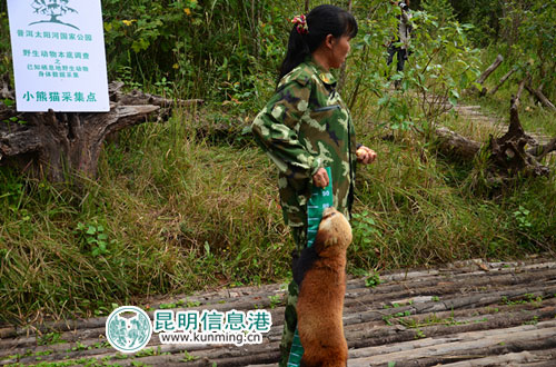 普洱太阳河国家公园小熊猫栖息地一共有36只小熊猫,将分批次、在一个月内采集完成。采集小组组长缪志选介绍:“小熊猫的采集是根据小熊猫本来的特点来进行引导的。小熊猫喜欢抱人的大腿,因此想到身长可以通过这个方法测量;而小熊猫喜爱吃苹果,站立取食的能力比较强,因此用苹果就可以把小熊猫引到秤上站立,顺利测量小熊猫的体重。”