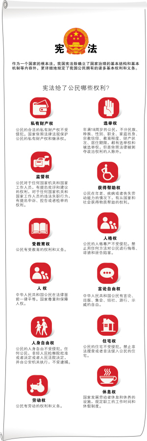 将12月4日设立为国家宪法日,国家通过多种形式开展宪法宣传教育活动。那么,宪法与我们有什么关系?你知道宪法赋予公民的基本权利有哪些吗?宪法宣誓仪式有什么样的含义?依法治国和宪法的关系又是什么?今日是首个宪法日,本报以特别报道的形式,对宪法以及宪法日的相关知识进行全面介绍和解读,让市民了解宪法,让宪法从文本走入生活。
