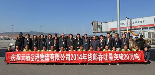 昆明信息港讯 记者上官艳君 12月23日下午2时,随着南航一架A320客机徐徐降落在昆明长水国际机场,至此,云南空港物流公司年货邮吞吐量突破20万吨大关,再创历史新高。云南机场集团副总裁、长水机场党委书记邓喜平,副总裁姜文忠等领导到停机坪参加了简短的庆祝仪式。