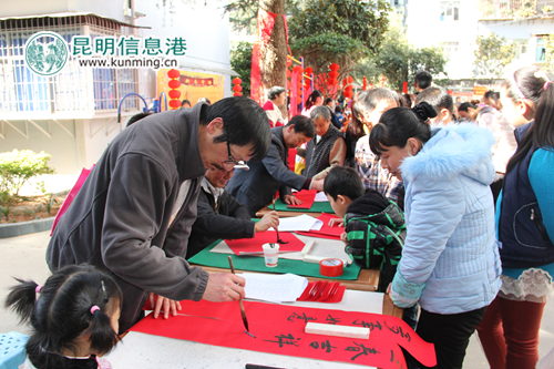 在活动现场的另一个角落里,几张桌子一字排开,案上笔墨纸砚一应俱全,来自辖区的书法“大家”们为居民们义写春联。居民们或选好内容索要,或驻足等待一副副春联妙笔出炉。