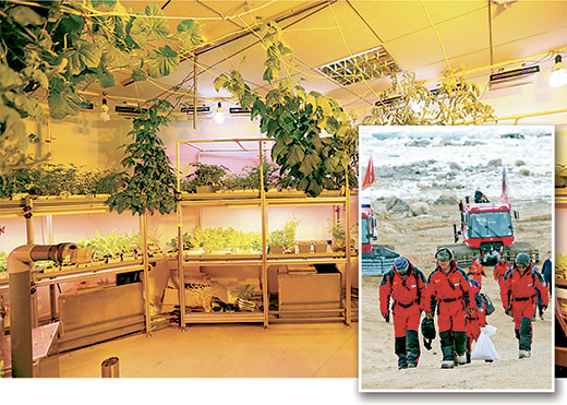 大图:中山站温室实验室内蔬菜生长情况。小图:队员凯旋。