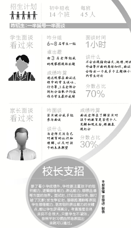“我们同时会面谈家长,听听他们对教育的认识和理解,以及对孩子未来的期望。家长对孩子的教育必须要有个人的见解和观点,今后家庭教育和学校教育的配合才会默契。”艾洪羽介绍,学生和家长的面谈成绩,将按7:3的比例综合后成为最终录取依据。