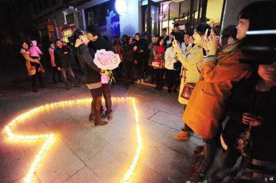 3月15日晚上,湖北经济学院门前广场上的一幕吸引了不少人围观:几百支蜡烛围成一圈,一名男生手捧玫瑰花站在蜡烛当中,只求女友回心转意。