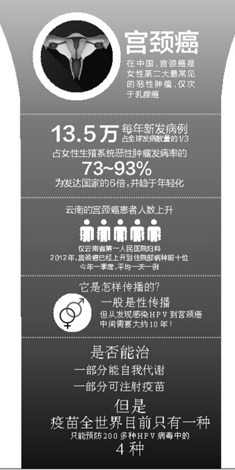 “在云南,10年前,子宫肌瘤、卵巢囊肿这类良性肿瘤是我们见得最多的妇科疾病。”袁涛说,但是从省一院妇科的临床数据来看,2012年,宫颈癌已经上升到该院住院部病种前十位,到2015年,已经进入了前三位,远远超过了其他良性肿瘤的发病。根据粗略统计,从今年一月到目前,在床位紧张的情况下,省一院妇科已经接诊了100余例宫颈癌患者,几乎平均每天一例。