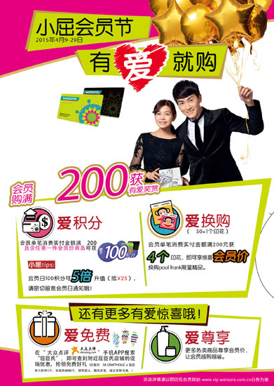 来自屈臣氏会员卡代言人陈妍希、郑元畅的重要提示:屈臣氏“有爱就购”会员节正式开启啦!4月9-29日,屈臣氏“爱积分、爱换购、爱免费、爱尊享”四大精彩活动为全国逾4000万会员精心呈上,会员购满200元可获额外100积分(会员日100积分5倍升值抵25元哦),集印花享惊喜会员价换购paul frank限量精品等……让会员切实感受到来自屈臣氏深深的“爱意”。除了带上实体会员卡来屈臣氏享受尊属优惠以外,绑定手机版会员卡可享受更多便利!