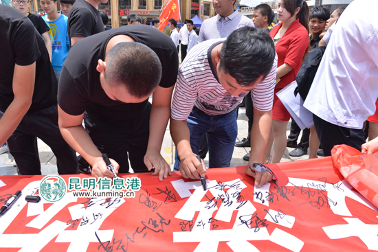 “珍爱生命、拒绝毒品、遏制艾滋、健康娱乐。”活动现场,参加活动的人员齐声诵读禁毒防艾口号,并观看由昆明信息港制作的禁毒防艾宣传片。昆明市文化市场综合执法支队工作人员向参加活动的娱乐场所从业人员代表发出禁毒防艾自律倡议书及宣传资料,并号召市民在印有宣传主题的横幅上签名。现场还组织参会人员参观禁毒防艾展览并听取禁毒防艾专家知识讲解。