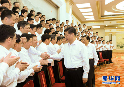 上午9时30分,习近平等来到人民大会堂西大厅,同受表彰的优秀县委书记亲切握手,并合影留念。