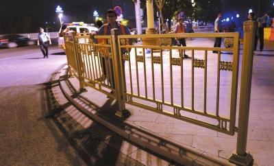 昨天凌晨,施工人员在更换长安街人行道护栏。京华时报记者 范继文 摄