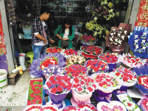 国防花市一早就变成了红玫瑰的海洋,成束和成盒的玫瑰花错落有致地摆放在花店里和店门口,买花的以男士为主。前天夜里,大多数的花店老板度过了一个不眠夜。红情花卉店的老板李英通宵包了100多束红玫瑰,预估到花不够卖,她昨天凌晨五点又到岔街花市买了1000多枝红玫瑰。
