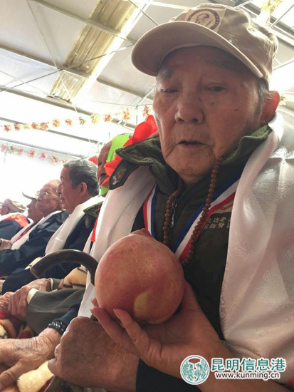 昆明信息港讯 记者王黎媛 9月19日,民盟云南省委、云南省青联、云南知行合一公益团队在昆明知青老年公寓举行“老兵不朽——慰问在滇抗战老兵公益活动”,大家为抗战英雄和老人们表演了丰富多彩的文艺节目,新知集团出品的李勇雪桃现场敬献抗战英雄,获得一致好评。