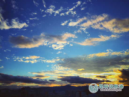 这两天,昆明晚霞频繁出现预示晴好天气将继续下去。美丽的彩霞是怎样形成的呢?霞是由于日出和日落前后,阳光通过厚厚的大气层,被大量的空气分子散射的结果。当空中的尘埃、水汽等杂质越多,其色彩愈瑰丽。如果有云层,云块也会染上橙红艳丽的颜色。