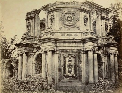 照片显示的是大报恩延寿寺全景,寺庙前两侧有两个大石狮子,石狮子之间一片瓦砾,大报恩延寿寺天王殿已经不见踪影,天王塑像只剩下下半身,衣衫精美。天王塑像旁有两座经幢,五六层高。照片右侧中部有转轮藏和万寿山昆明湖石碑。照片中还有通往大报恩延寿寺最高建筑佛香阁的平台扶手。