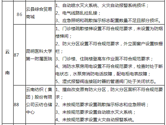 由于门诊楼疏散楼梯设置、防火分区设置、登高车作业面、消防水泵房用电设置不符合规范要求,及湿式报警阀连接延时器的管道阀门处于关闭状态等原因,云南省昆明医科大学第一附属医院存重大火灾隐患。另外,云县综合贸易商城及云南纺织(集团)股份有限公司云纺仓储中心因自动喷水灭火系统、火灾自动报警系统损坏等原因被列入榜单。