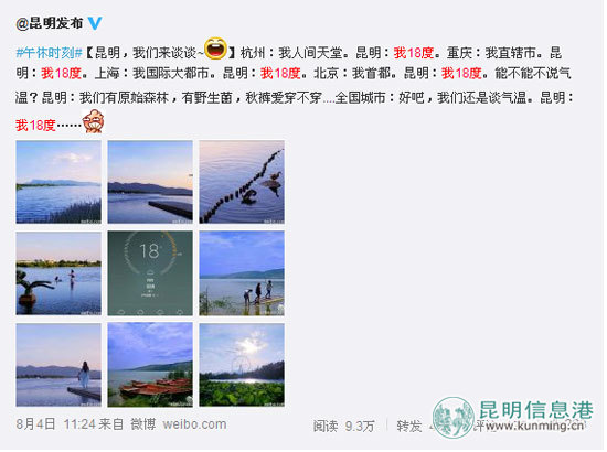 2015年8月,全国各地进入“炎夏”季节,@昆明发布 策划“昆明18度”微话题,采用网络段子形式推广昆明“凉夏”特点,迅速在各大网站及微博、微信平台被网民广泛传播,“昆明18度”一时间成为最能体现昆明特质的网络热词。