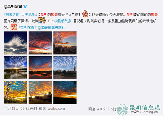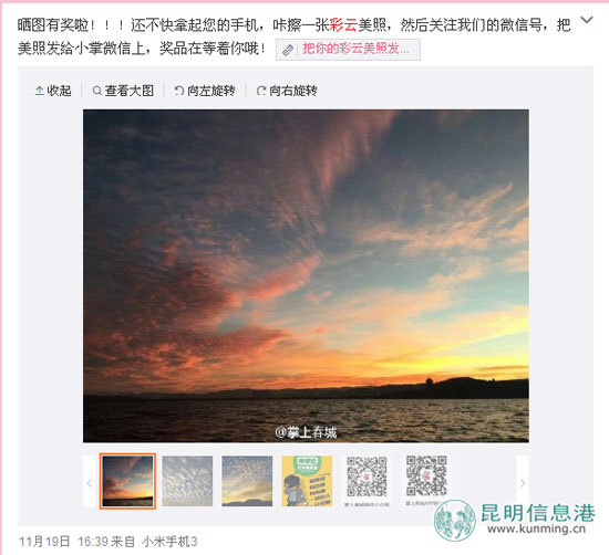 2015年11月,@昆明发布 “发现昆明之美”微话题晒火了昆明的彩云和蓝天,昆明美云刷爆微博、微信朋友圈,11月22日,“发现昆明之美”微话题上榜新浪微博全国热门话题第四名,网民阅读总量260余万次,3400余名网友参与了该话题讨论。除自主策划微活动与微话题之外,@昆明发布 还积极鼓励网民参与到城市宣传工作中来,对市民和网友参与活动的信息第一时间响应回复,并长期开通市民投稿渠道,将市民主动投稿晒“昆明之美”变为常态,增强了粉丝参与度与黏性,让网友在参与中获得“成就感”与“自豪感”,“我家昆明就是美”成为市民的共识。
