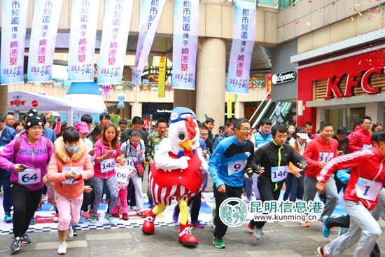昆明信息港讯 记者杨炎 12月19日,一场别开生面的冬季健康跑活动在昆明肯德基顺城店门口拉开帷幕,上百名跑友齐聚一堂,在肯德基“奇奇”的带领下,从肯德基顺城店跑到正义坊店,最后在柏联店门口冲击终点线并与“奇奇”击掌庆祝,全程3公里。
