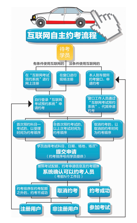 3考生按照车管所已公布的考试预约计划,可以通过互联网、电话、车管窗口等方式,自主选择考试时间、地点预约考试。