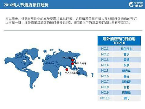 多出一天的时间,让情侣们的旅行时间更加充裕。携程旅游数据显示,今年春节情侣出游的平均时长要比2015年春节多出0.8天。目的地选择方面,诸如巴厘岛、马尔代夫等浪漫主题的度假海岛倍受欢迎,同时境外如韩国首尔塔、意大利罗马许愿池、境内如天涯海角、蝴蝶泉等纪念意义十足的景点也积攒了相当的人气。携程旅行专家表示:“这个情人节,赠送伴侣一次甜蜜的旅行俨然成为了情侣群体中的一种时尚。”