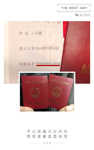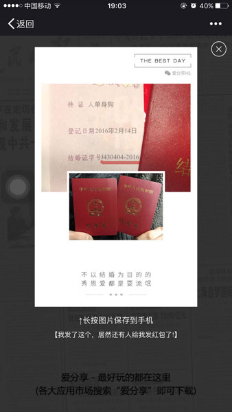 不过,这些“结婚证”是使用一款H5软件进行修改生成的。有好心网友提醒大家,据我国刑法第二百八十条【伪造、变造、买卖国家机关公文、证件、印章罪】伪造、变造、买卖或者盗窃、抢夺、毁灭国家机关的公文、证件、印章的,处三年以下有期徒刑、拘役、管制或者剥夺政治权利;情节严重的,处三年以上十年以下有期徒刑。没有买卖就没有杀害,不秀恩爱就没有伤害。爱护单身狗是每个高富帅白富美应有的美德!拒绝情人节各种花式秀恩爱,关护单身狗。
