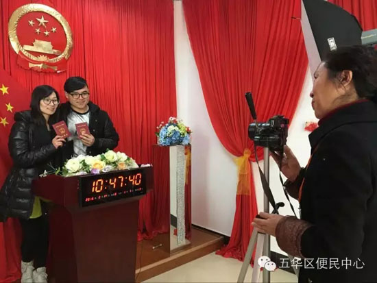 另外,据盘龙区民政局黄科长介绍,2015年12月1日开始,盘龙区民政局婚姻登记不再收取费用,并且简化了办证程序。只要证件带齐,整个流程下来包括婚检只需要30分钟左右,新人们不用提前太早来办理婚姻登记。