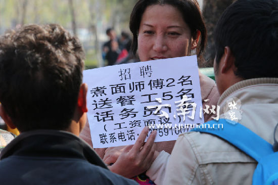 据了解,当天昆明南坝人力资源市场有近200家用工单位进场招聘,提供工作岗位3000余个,人流量近3000人次,从目前用工情况看,餐饮、保安和洗车等服务行 业急需用工。随着务工人员陆续返城,以及更多省内外用工单位进场招聘,近期将迎来一波劳务招聘高潮,南坝人力资源市场也将积极搭建供需市场的对接平台,组 织做好各项服务工作。(云南日报 记者杨峥摄)