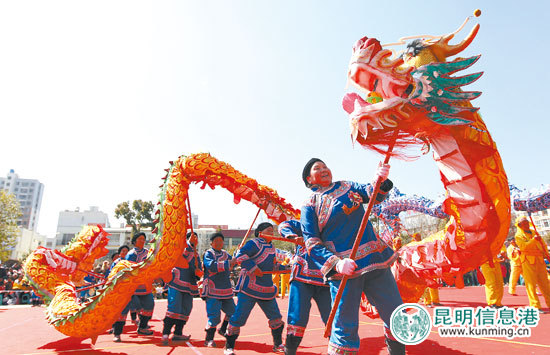 昆明的嵩明素有龙狮之乡、花灯之乡、兰茂故里和中国民间文化艺术之乡等美誉。2011年以来,“龙腾狮跃闹元宵”全国龙狮大联动昆明分会场龙狮大赛活动连续在嵩明举办。在巡演队伍中,来自嵩明小街镇阿古龙村的“小脚老奶”舞龙队格外引人瞩目,这支平均年龄70岁以上,身穿蓝色绣花衣、花裤、花鞋的老奶奶精气神十足,舞龙技艺丝毫不逊年轻人。
