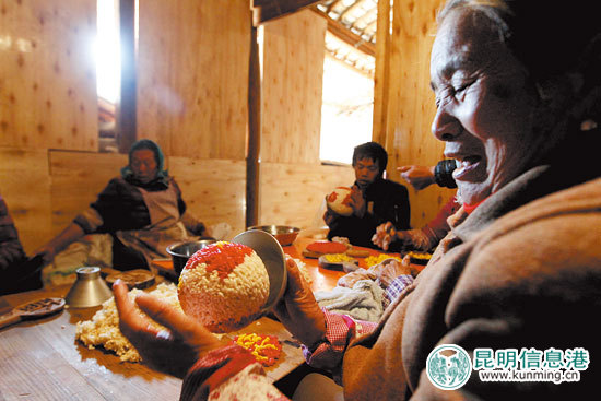 节前走进晋宁县回龙村,就能闻到“过年的味道”。在村民李树明的家里,8位老人正聚在一张桌子上忙碌着,一个个精致的米花团随着手指的转头“滚”出来。李树明介绍,快到过年时,赶上晴天,村里几乎家家户户都会做米花团,但现在只剩下3家左右。不过,“筛米、染色、沙炒、熬糖、拌糖、装模、搓团、‘养团’”这8个传统步骤和印字的模具都是一直沿袭至今。米花团有着不同的尺寸,大小都有两面“花”,最大的米花团约一公斤,前后印着“福”“寿”二字。