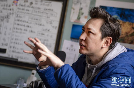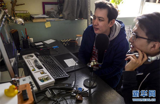 达尼亚尔(左)与团队主创人员呼尔察为搞笑视频配音