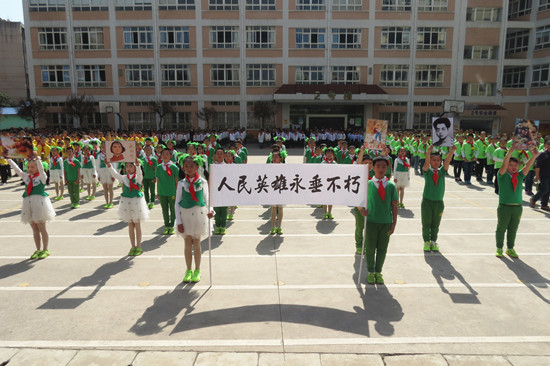 活动现场,四(1)班的同学们娓娓道来,讲述先烈故事,缅怀先烈、放飞理想,引领全场共同缅怀英烈。五年级的学生们手捧菊花,在操场上站出“清明”字样的队形,其他年级的学生代表们手拿“追思心愿卡”、千纸鹤、黄丝带贴上“清明祭英烈 共铸中华魂”追思心愿墙上。