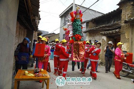 迎送城隍前在寺队鸣土炮三响,到乡公所后场(现古城水塔后)宣读纪文鸣三响,回到寺内鸣三响。迎城隍这天各家各户门前清扫干净,凭自己的能力在门前摆上(香贡)不爱肉、水米、糖食等,以求便宜清洁平安。多年来村民认为迎送城隍以求风调雨顺、四季丰收,因而筵席至今。迎城隍过三月十三,家家都换些米线,过节时每人一碗吃个够,因而年复一年人们就把迎城隍赶庙会说成“米线节”。