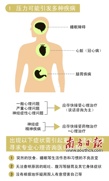 “压力山大”自然不限于学生。记者身边的朋友就有不少人时常表示压力不小,个别已经影响正常生活。市第二人民医院的医生和市心理协会的心理咨询师介绍,压力除了影响精神健康,还会引起睡眠障碍、肠胃不适和冠心病等身体疾病。