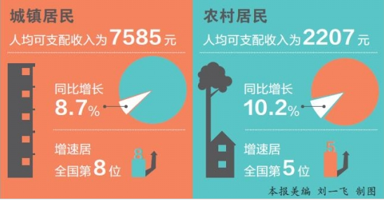 居民收入平稳增长。一季度全省居民人均可支配收入为4256元,同比增长10.1%,增速较上年同期放缓0.5个百分点,但仍高于全国平均1.4个百分点,增速居全国第4位。按常住地分,城镇居民人均可支配收入为7585元,同比增长8.7%,增速高于全国平均0.7个百分点,增速居全国第8位;农村居民人均可支配收入为2207元,同比增长10.2%,增速高于全国平均1.1个百分点,增速居全国第5位。