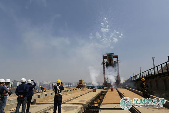 5月10日10时18分,随着中铁九局承建的昆明铁路枢纽黑龙潭特大桥最后一片长24.6米,重量100多吨的T型梁的架设完毕,标志着云南高铁昆明南站至动车所的走行四线全线贯通,云南迈入高铁时代又前进了重要一步。