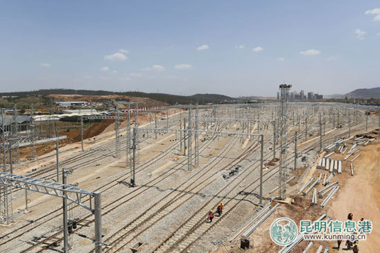 据中铁九局施工负责人介绍,昆明南站至动车所的走行四线途径岩溶区、膨胀土岩区和水源区,施工难度大,环保要求高,2014年4月开工建设以来,施工单位投入1000多人、200多台机械设备日夜施工,确保了线路施工的顺利完成。